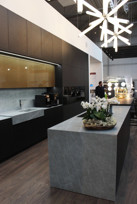 Pracovní keramickou desku z naší výroby jste mohli vidět i ve výstavním stánku kuchyňského studia Dot Kuchyně, které navrhuje kuchyně od německého výrobce DanKüchen. Kromě tohoto stánku se naše produkty staly součástí prezentace prestižního českého výrobce interiérů - Hanák Nábytek, který získal ocenění TOP EXPO od odborné poroty veletrhu. Dodali jsme jim na míru zhotovený keramický lepený dřez a pracovní desku ostrova v stylovém vzoru šedé imitace kamene Zaha Stone.