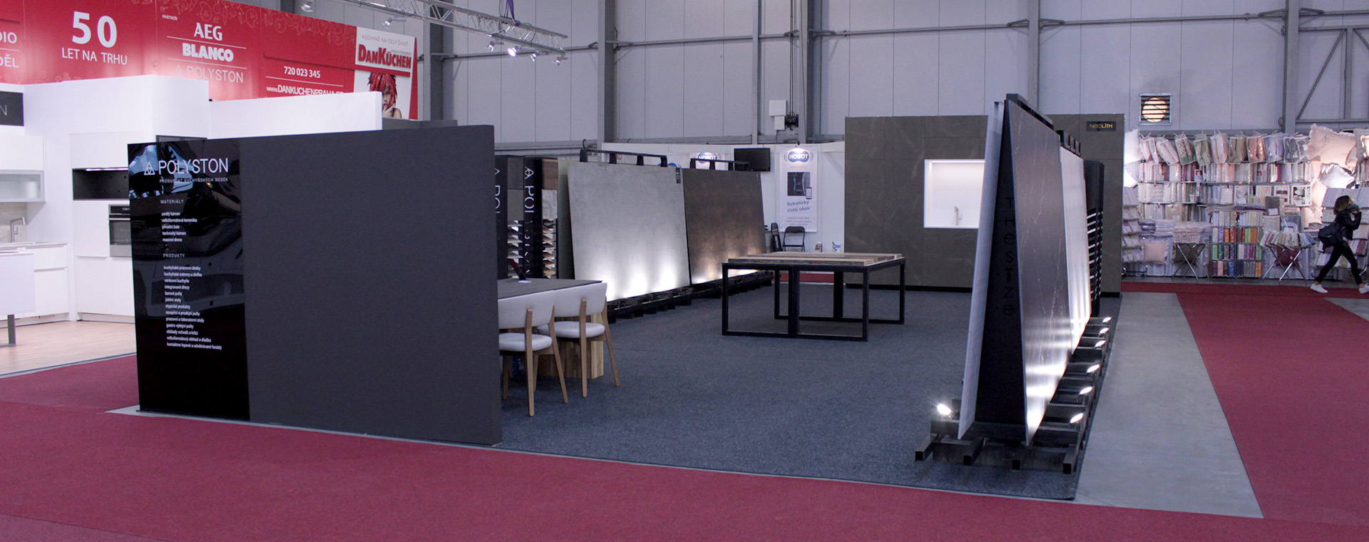 Velkoformátové desky keramiky jsme vystavovali v maximálním formátu, z kterého je možné vyrobit produkty na míru. Ze španělské keramiky Neolith byla vyrobena i celá kuchyně s kuchyňskými keramickými dvířkami. Kuchyňská nika z umělého kamene Polyston Solid Surface ve vzoru Ultra White, byla vyrobena z vícero dílů, kuchyňského dřezu a zástěny, které byly spojeny do jednoho monolitého kusu bez viditelných spojů.